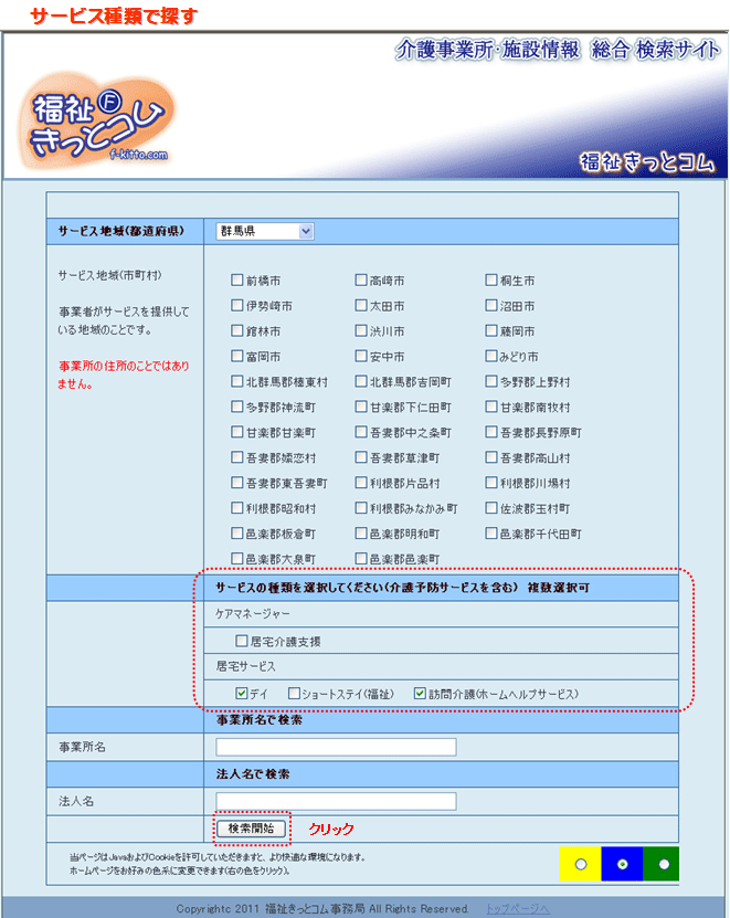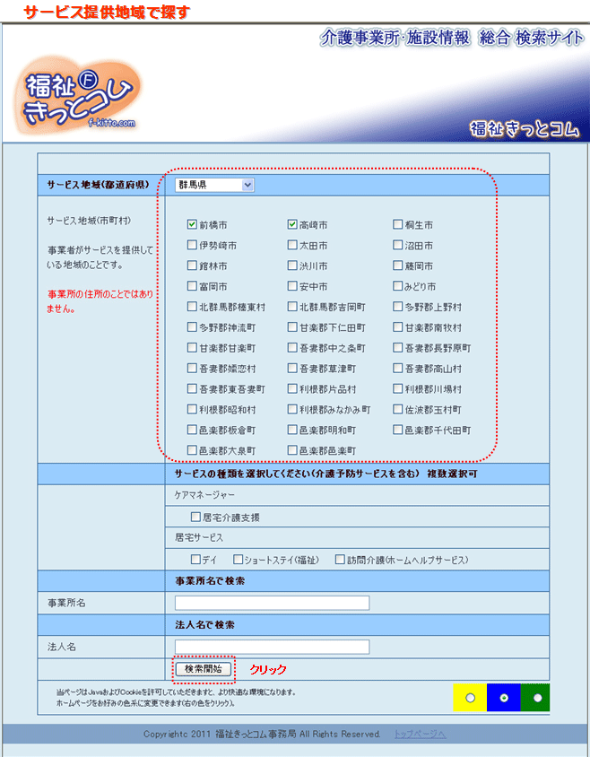 ※サービス種類のみでの検索をする場合は、都道府県→「選択して下さい」を選択します。 |
