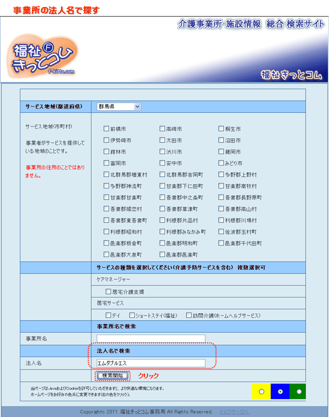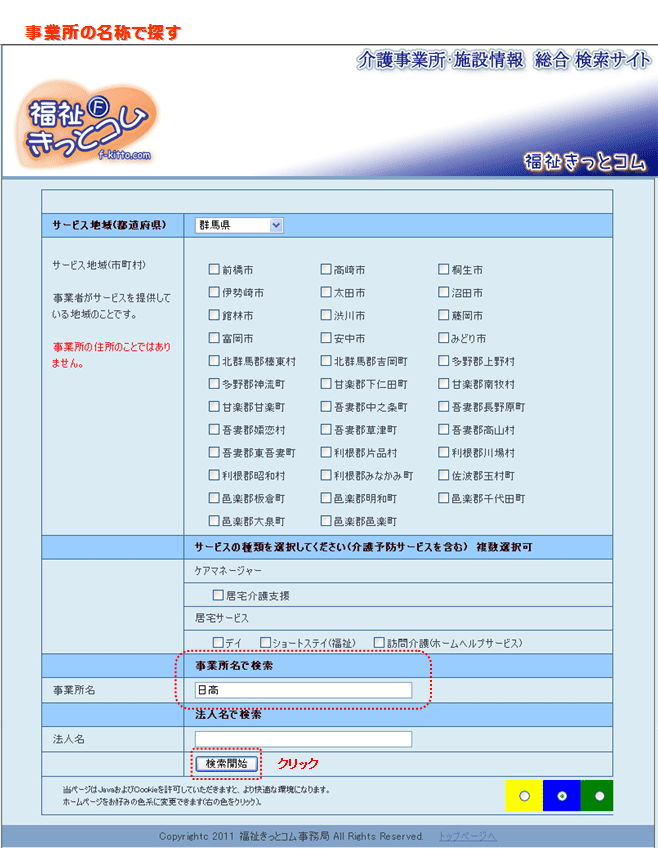 事業所名称は事業所ページでタイトル部分に出てくる名称です。 ※全国での検索をする場合は、都道府県→「選択して下さい」を選択します。 |