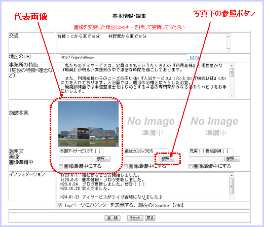 4.「基本情報・編集」画面で、「施設写真」 写真下の参照ボタンをクリックします。