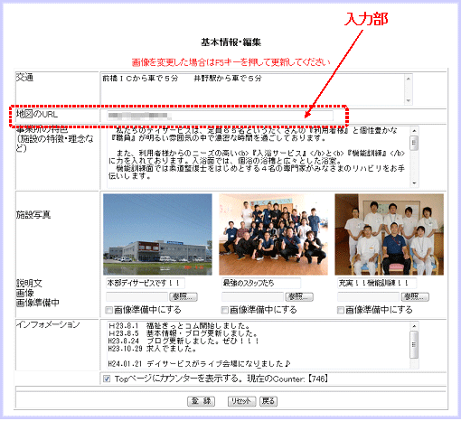 基本情報のページには3枚の写真(画像)を掲載できます。 「福祉きっとコム」では検索結果の一覧サムネイル画像に、3枚中一番左の画像を「代表画像」として使用しています。
