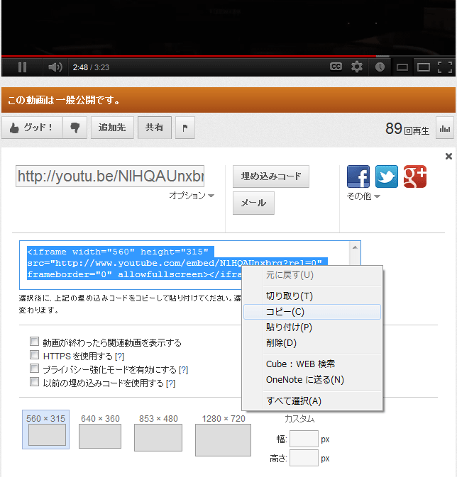 4.アップロードした、動画のページを表示して、「共有」→「埋め込みコード」をクリックします。
